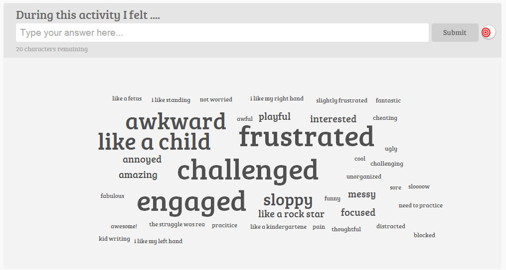 When starting our presentation, we wanted to be able to use tools that were not already used. Being second to last, this was a difficult task. We chose Emaze from a Google search and were excited to learn how to use it. It was frustrating at times because neither one of us knew the answers when we would encounter problems. I found it interesting that Google Forms was not used in any of the previous presentations. The multiple possibilities with add ons like Flubaroo and the fact that it is so user friendly made it seemed like a great option. I learned about AnswerGarden at the Great 14 conference and decided to introduce it to those in the class that did not attend that session. We used this tool to express how people felt when asked to stand up and use non-dominant hand to write. The results from this survey was extremely interesting to me when I compared their responses to how I feel when I do not have my phone. This proved to me that technology, especially my phone, has become an extension to my life.